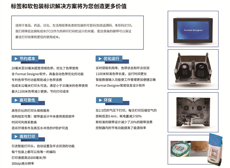 產品簡介:適用于食品、藥品、日化、生活用紙等各類軟包裝的可變碼(包括追溯碼、條形碼)打印。我們將降低總擁有成本(TCO)作為熱轉印打碼機設計的關鍵,配合原裝的碳帶可以保證最佳打印效果和更低的使用成本。